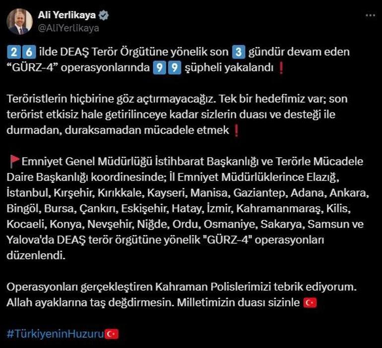 Bakan Yerlikaya açıklamasında şu ifadeleri kullandı; 26 ilde DEAŞ Terör Örgütüne yönelik son 3 gündür devam eden “GÜRZ-4” operasyonlarında 99 şüpheli yakalandı.