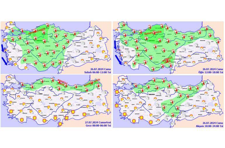 CNN Türk Meteoroloji Danışmanı Prof. Dr. Orhan Şen, “Bugün yağışların; Ankara, Çankırı, Kırıkkale, İstanbul, Kocaeli, Sakarya, Kastamonu Adana ve Mersinde yerel kuvvetli. Batı Karadeniz kıyılarında Zonguldak, Bartın Bozkurt, Ayancık Sinop’a kadar yer yer çok kuvvetli ve şiddetli olacak taşkın ve su baskınlarına karsı tedbirli olun.