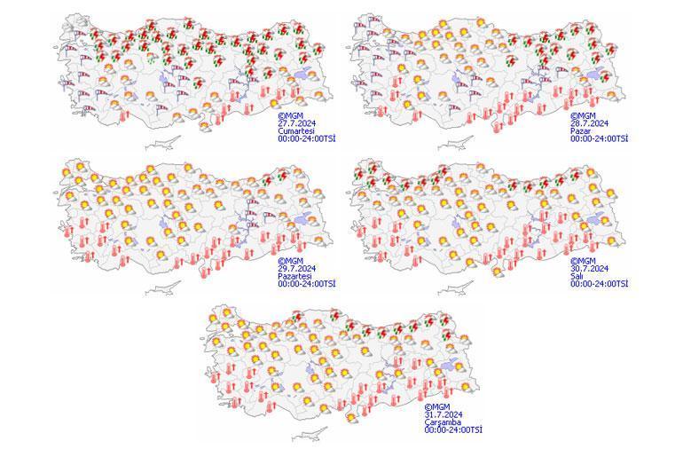 İstanbul bugün yağmurlu 29, Pazar 33 derece. Ankara kuvvetli yağmurlu 28 Pazar, 31 derece. İzmir 33, pazar 37 derece, Antalya 36, pazar 40 derece. Rüzgar güney Ege kıyılarında kuzey batıdan kuvvetli esecek. Bugün iç Anadolu’nun tamamında da hafif yağmur geçişleri görülecek”