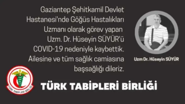 Göğüs hastalıkları uzmanı Dr. Hüseyin Süyür, Gaziantep’te bir hastanenin Covid-19 servisindeki hastaları tedavi ederken fenalaştı ve 24 Kasım’da Covid-19 sebebiyle hayatını kaybetti.