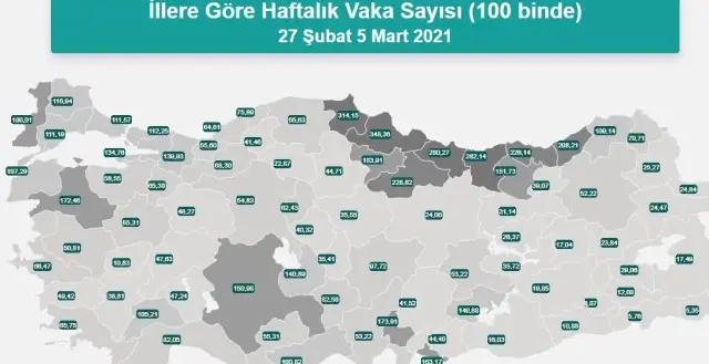 “covid19.saglik.gov.tr” adresinden paylaşılan tabloya göre, 27 Şubat-5 Mart 2021 tarihleri arasında illere göre haftalık vaka sayısı, her 100 bin kişide İstanbul’da 111,57, Ankara’da 54,83, İzmir’de 66,47 oldu. Vaka sayısı en yüksek iller ise , Samsun 348,36, Sinop 314,15 ve Giresun 282,14 olarak sıralandı.