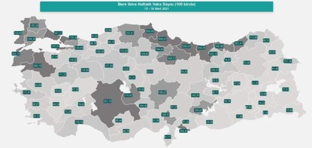 “covid19.saglik.gov.tr” adresinden paylaşılan tabloya göre, 6-12 Mart 2021 tarihleri arasında illere göre haftalık vaka sayısı, her 100 bin kişide İstanbul’da 178,25, Ankara’da 68,53, İzmir’de 78,57 oldu. Vaka sayısı en yüksek iller ise Samsun 458,53, Sinop 345,56 ve Giresun 296,84 olarak sıralandı.