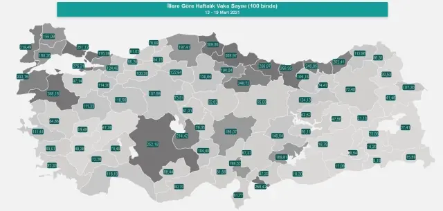Sağlık Bakanı Fahrettin Koca, 13-19 Mart haftasında illere göre 100 bin kişiye düşen Kovid-19 vaka sayısının güncel haritasını paylaştı. Buna göre veriler aşağıdaki gibidir.