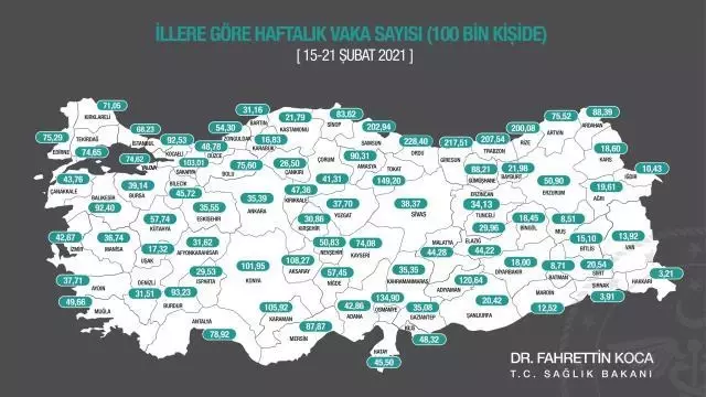 “covid19.saglik.gov.tr” adresinden paylaşılan tabloya göre, 15-21 Şubat 2021 tarihleri arasında illere göre haftalık vaka sayısı, her 100 bin kişide İstanbul’da 68,23, Ankara’da 35,39, İzmir’de 42,67 oldu. Vaka sayısı en yüksek iller ise Ordu, Giresun ve Trabzon olarak sıralandı.