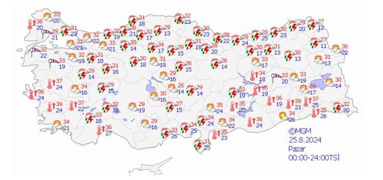 Meteoroloji Genel Müdürlüğü tarafından yapılan son tahminlere göre: Ülkemizin kuzey, iç ve güney kesimlerinin parçalı, yer yer çok bulutlu, İç Ege, Batı Akdeniz’in iç kesimleri, Doğu Akdeniz, İç Anadolu’nun kuzey ve doğusu, Karadeniz, Doğu Anadolu’nun kuzeyi ile İstanbul, Malatya ve Hakkari çevrelerinin yerel olmak üzere sağanak ve gök gürültülü sağanak yağışlı, diğer yerlerin az bulutlu ve açık geçeceği tahmin ediliyor. Yağışların; Sinop, Samsun, Ordu, Giresun, Trabzon, Rize, Hatay kıyıları ile Osmaniye çevrelerinde yerel kuvvetli olması bekleniyor. Rüzgarın; Marmara’nın güneybatısı ile Kuzey Ege’de kuzeyli yönlerden, Doğu Anadolu’nun doğusu ile Güneydoğu Anadolu’nun doğusunda kuvvetli (40-60 km/saat) olarak eseceği tahmin ediliyor.