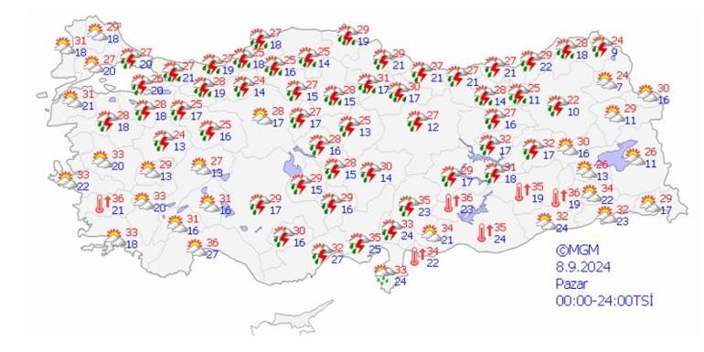Meteoroloji Genel Müdürlüğü tarafından yapılan son tahminlere göre: Ülkemizin kuzey ve iç kesimlerinin parçalı yer yer çok bulutlu, Marmara’nın kuzey ve doğusu, İç Ege’nin kuzeyi, Isparta dışında Batı Akdeniz’in iç kesimleri ile Doğu Akdeniz, İç Anadolu’nun kuzey ve doğusu, Karadeniz, Doğu Anadolu’nun kuzey ve batısının yerel sağanak ve gök gürültülü sağanak yağışlı, diğer yerlerin az bulutlu ve açık geçeceği tahmin ediliyor. Yağışların, Marmara’nın kuzeyi, Doğu Akdeniz’in Toroslar kesimi, Batı Karadeniz kıyıları, Orta ve Doğu Karadeniz’in iç kesimleri ile Doğu Anadolu’nun kuzeyinde yerel kuvvetli olması bekleniyor.