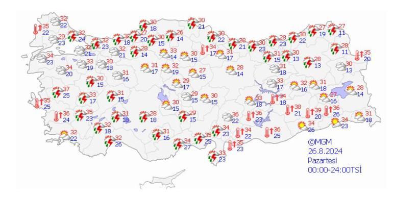 Parçalı ve az bulutlu, iç kesimlerinin yer yer çok bulutlu, bu akşam saatlerinde Kütahya, Afyonkarahisar ve Denizli’nin güney ve doğu kesimleri ile yarın (Pazartesi) öğle saatlerinden sonra İç Ege’nin yerel olmak üzere sağanak ve gök gürültülü sağanak yağışlı geçeceği tahmin ediliyor.