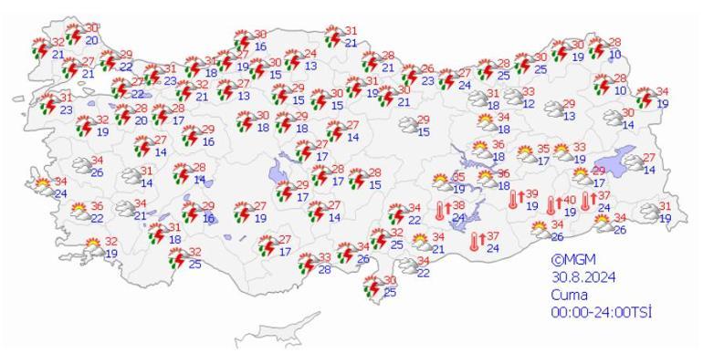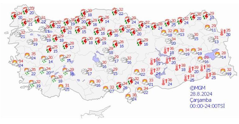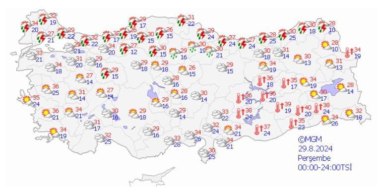 Meteoroloji Genel Müdürlüğü tarafından yapılan son tahminlere göre: Ülkemizin kuzey ve iç kesimlerinin parçalı yer yer çok bulutlu, İç Ege, Akdeniz, İç Anadolu, Karadeniz, Doğu Anadolu’nun kuzeydoğusu, İstanbul, Kocaeli, Sakarya, Malatya ve Erzincan çevreleri, Kırklareli’nin kıyı ilçeleri, Tekirdağ’ın doğusu ile Balıkesir’in kuzey ve doğu kesimlerinin yerel olmak üzere sağanak ve gök gürültülü sağanak yağışlı geçeceği tahmin ediliyor. Yağışların bu akşam saatlerinde Sinop, Samsun, Malatya ve Kahramanmaraş’ın batısında yer yer kuvvetli olması bekleniyor.