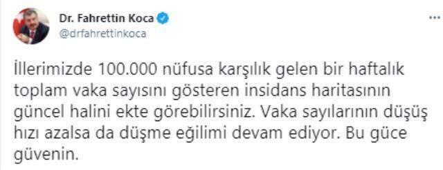 Haritayı sosyal medya hesabından paylaşan Bakan Koca, “İllerimizde 100.000 nüfusa karşılık gelen bir haftalık toplam vaka sayısını gösteren insidans haritasının güncel halini ekte görebilirsiniz. Vaka sayılarının düşüş hızı azalsa da düşme eğilimi devam ediyor. Bu güce güvenin” sözlerine yer verdi.