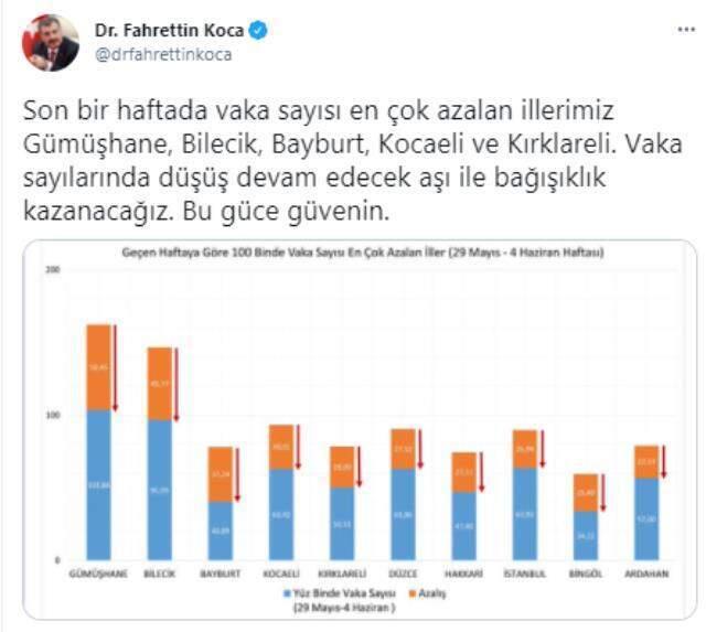 Son bir haftada vaka sayısı en çok azalan illerimiz Gümüşhane, Bilecik, Bayburt, Kocaeli ve Kırklareli oldu. Bakan Koca, illere ait grafiği yine sosyal medya hesabından paylaştı.