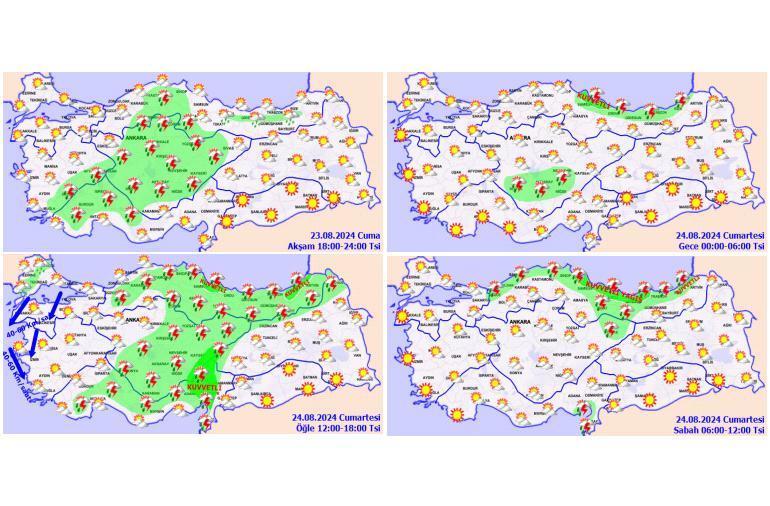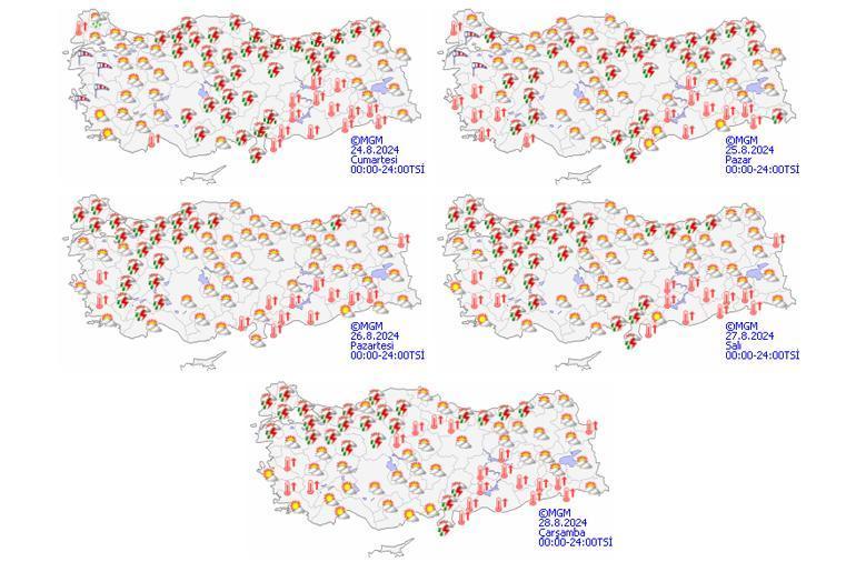 Meteoroloji Genel Müdürlüğü tarafından yapılan son tahminlere göre: Ülkemizin kuzey ve iç kesimlerinin parçalı, yer yer çok bulutlu, Trakya’nın batısı, Ege’nin güneydoğusu, Akdeniz’in iç kesimleri ile İskenderun Körfezi çevreleri, (Eskişehir dışında) İç Anadolu ve Karadeniz ile Doğu Anadolu’nun kuzeydoğusunun sağanak ve gök gürültülü sağanak yağışlı, diğer yerlerin az bulutlu ve açık geçeceği tahmin ediliyor. Cumartesi beklenen yağışların Orta ve Doğu Karadeniz kıyıları, İskenderun Körfezi çevreleri, Osmaniye ve Kahramanmaraş ile Kayseri’nin doğu, Sivas’ın güney çevrelerinde yerel kuvvetli olacağı tahmin ediliyor.