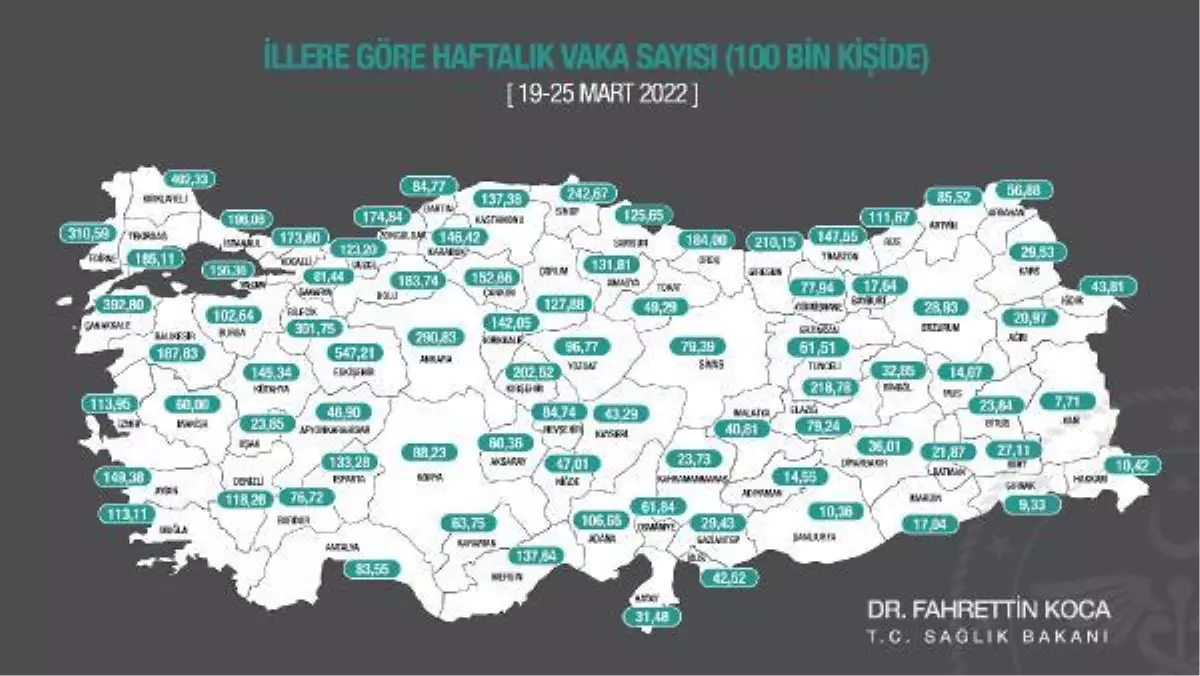 100 binde en çok vaka görülen iller Eskişehir (547,21), Kırklareli (402,33), Çanakkale (392,8), Edirne (310,59), Bilecik (301,75) oldu.