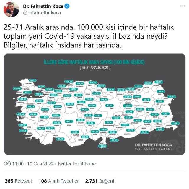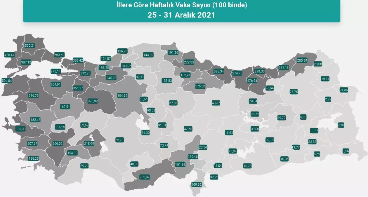Sağlık Bakanı Fahrettin Koca, 25-31 Aralık haftasında illere göre 100 bin kişiye düşen Kovid-19 vaka sayısının güncel haritasını paylaştı. Buna göre veriler aşağıdaki gibidir.