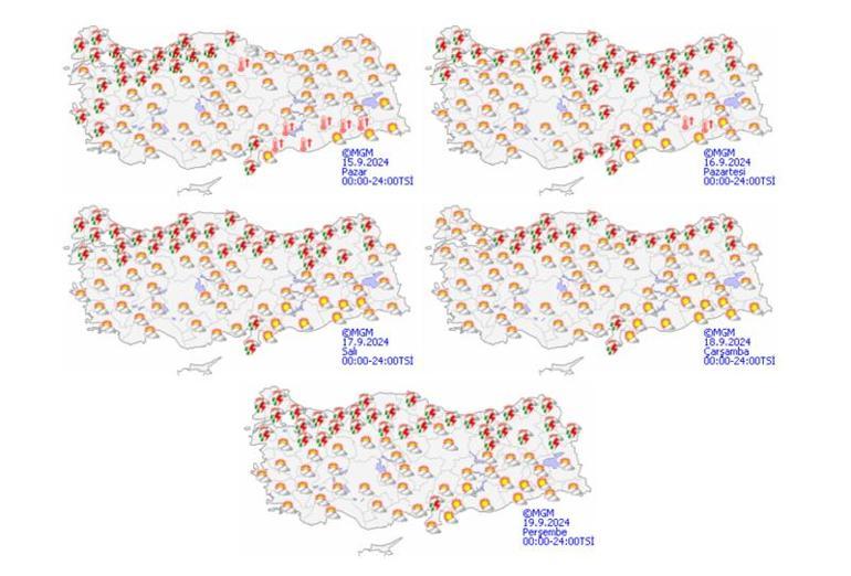 Meteoroloji Genel Müdürlüğü tarafından yapılan son tahminlere göre: Ülkemizin kuzeybatı kesimlerinin parçalı, yer yer çok bulutlu, Marmara (Çanakkale haric), Kıyı Ege ve Batı Karadeniz’in (Sinop haric) ile Kars ve Hakkari çevrelerinin yerel sağanak ve gök gürültülü sağanak yağışlı, diğer yerlerin az bulutlu ve açık geçeceği tahmin ediliyor. Yağışların Batı Karadeniz kıyıları ve İstanbul çevrelerinde yerel kuvvetli olması bekleniyor. Rüzgarın, Akdeniz kıyılarında güney ve batılı yönlerden yer yer kuvvetli (40-60 km/saat) esmesi tahmin ediliyor.