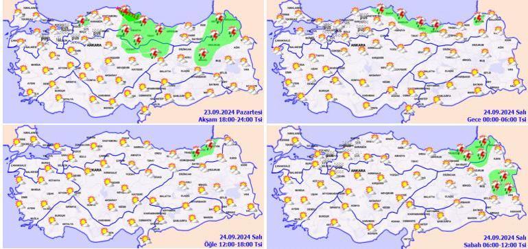 Meteoroloji Genel Müdürlüğü tarafından yapılan son tahminlere göre: Ülkemiz genelinin parçalı yer yer çok bulutlu, Doğu Karadeniz kıyıları ve Orta Karadeniz ile Sivas, Yozgat, Sinop, Zonguldak, Artvin, Iğdır’ın güneyi, Van’ın kuzeyi, Erzurum, Ardahan, Ağrı, Kars ve Bingöl çevrelerinin yerel sağanak ve gök gürültülü sağanak yağışlı geçeceği tahmin ediliyor. Marmara’nın doğusu ve Batı Karadeniz’de yer yer sis ve pus bekleniyor. Yağışların, Sinop ve Samsun çevrelerinde yer yer kuvvetli olması bekleniyor.