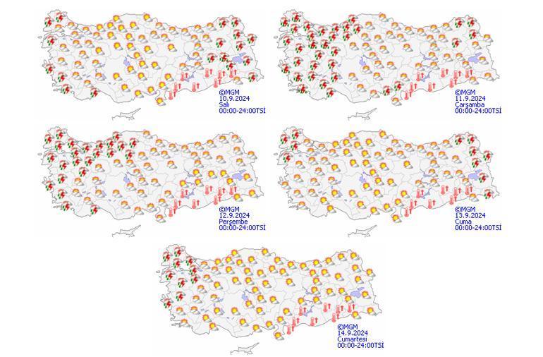 Meteoroloji Genel Müdürlüğü tarafından yapılan son tahminlere göre: Ülkemizin doğu kesimleri ile Marmara, Ege ve Batı Akdeniz’in parçalı yer yer çok bulutlu, Kıyı Ege, Batı Akdeniz kıyıları, Doğu Anadolu’nun doğusu, Giresun ve Artvin çevreleri ile Trabzon ve Rize’nin iç kesimlerinin yerel olmak üzere sağanak ve gök gürültülü sağanak yağışlı, diğer yerlerin az bulutlu ve açık geçeceği tahmin ediliyor. Yağışların, Muş çevreleri ile Ağrı’nın güney kesimlerinde yer yer kuvvetli olması bekleniyor.