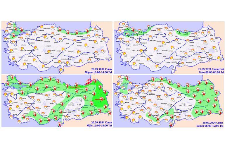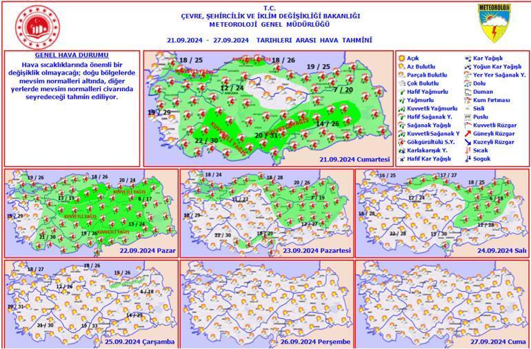 Meteoroloji Genel Müdürlüğü tarafından yapılan son tahminlere göre: Ülkemiz genelinin parçalı ve çok bulutlu, Marmara (Edirne, Kırklareli hariç), İç Ege, Akdeniz, Batı ve Doğu Karadeniz, Orta Karadeniz kıyıları, İç Anadolu’nun güney ve batısı, Doğu Anadolu, Güneydoğu Anadolu’nun yerel sağanak ve gök gürültülü sağanak yağışlı geçeceği tahmin ediliyor. Yağışların Batı Akdeniz’in iç kesimleri, Doğu Akdeniz, Doğu Anadolu’nun güneybatısı ile İstanbul, Sakarya, Kocaeli, Malatya, Elazığ, Bingöl, Muş, Bitlis, Batman, Siirt, Sinop çevreleri ve Diyarbakır’ın kuzeykesimleri, Kastamonu kıyıları ile Afyonkarahisar’ın doğu kesimlerinde yerel olmak üzere kuvvetli olması bekleniyor. Rüzgarın, Marmara’nın batısı ile kıyı Ege’de kuzey yönlerden 40-60 km/saat) kuvvetli esmesi tahmin ediliyor.