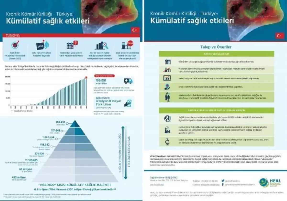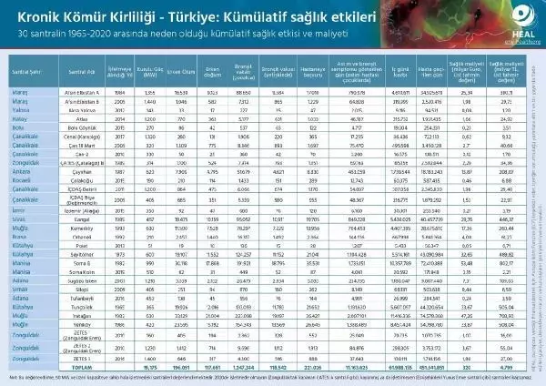 Ayrıca, kömür santrallerinin sağlık maliyetinin yanı sıra 117 bin 661 erken doğuma, 1 milyon 247 bin çocukta bronşit vakasına, 62 milyon iş günü kaybına yol açtığı da ortaya çıktı. Rapora göre, sadece Zonguldak, Çanakkale, Muğla ve İskenderun Körfezi’ndeki termik santrallerin neden olduğu sağlık yükü, Türkiye toplamının yüzde 40’ına karşılık geliyor.