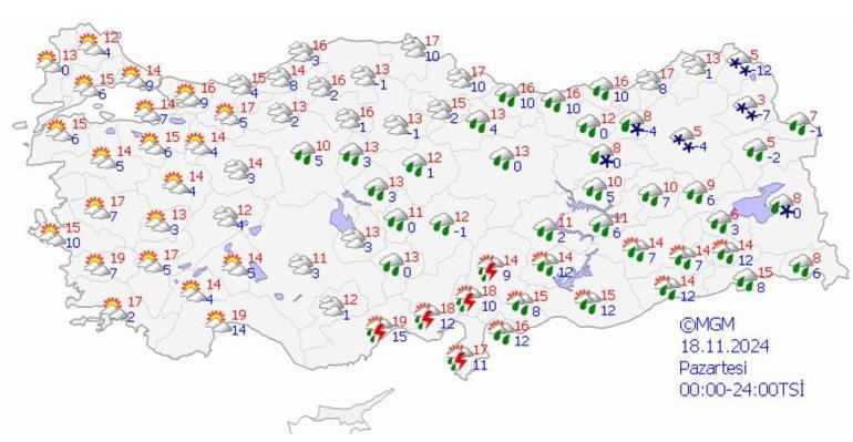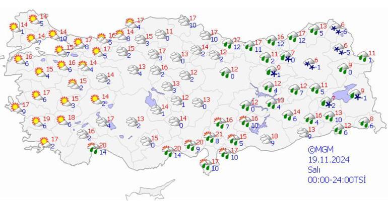Parçalı ve az bulutlu, zamanla çok bulutlu, Batı Akdeniz ile Mersin, Adana ve Osmaniye çevrelerinin sağanak ve gök gürültülü sağanak yağışlı geçeceği tahmin ediliyor.