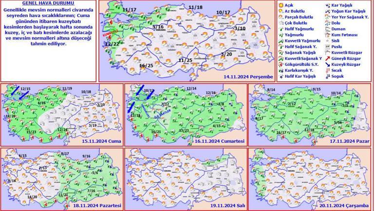 CNN TÜRK Meteoroloji Danışmanı Prof. Dr. Orhan Şen, “Bugün Marmara, Ege, Batı Karadeniz ile Eskişehir ve Ankara’nın kuzeyi yağışlı, Yağışlar; İzmir, Balıkesir ve Bursa çevrelerinde yerel kuvvetli su baskını yapabilir. Yarın sıcaklıklar tüm Türkiye’de 4-5 derece düşecek. Hafta sonu yağış alanı genişleyecek doğu Anadolu’ya kar gelir.