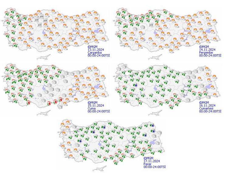 Meteoroloji Genel Müdürlüğünden alınan tahminlere göre yağışların; genellikle yağmur ve sağanak, Van ve Hakkari çevrelerinin yükseklerinde karla karışık yağmur ve kar yağışı şeklinde görülmesi bekleniyor. Yurdumuzun iç kesimlerinde pus ve yer yer sis görüleceği tahmin ediliyor.