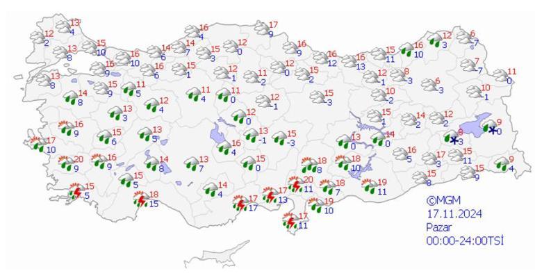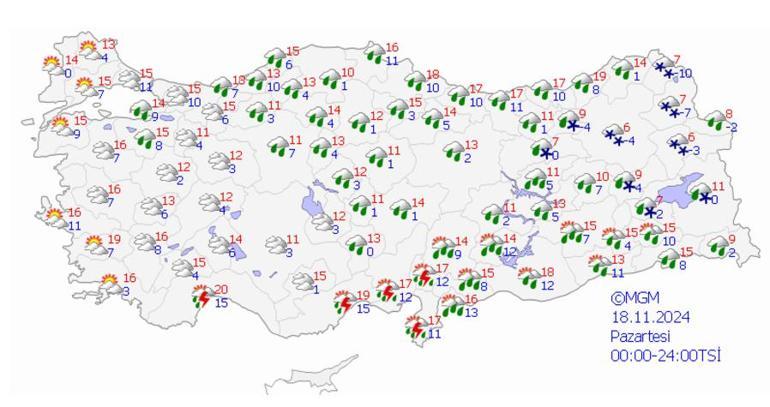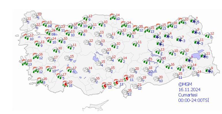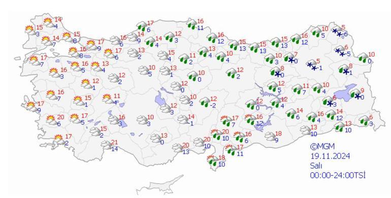 Meteoroloji Genel Müdürlüğü tarafından yapılan son tahminlere göre: Ülkemizin parçalı ve çok bulutlu, Marmara bölge geneli, Ege’nin kuzey ve batı, İç Anadolu’nun kuzey ve doğu, Batı Akdeniz’in kıyı, Doğu Akdeniz’in İskenderun Körfezi ve Toroslar kesimleri ile (Çorum hariç) Karadeniz ve (Şırnak hariç) Doğu Anadolu Bölgelerinin yağışlı geçeceği tahmin ediliyor. Yağışların, kıyı kesimlerde sağanak ve yer yer gök gürültülü sağanak, iç kesimlerde yağmur, Doğu Karadeniz ve Doğu Anadolu’nun yükseklerinde karla karışık yağmur ve (2200 metre üzerinde) yer yer kar şeklinde görülmesi bekleniyor. Ege’nin batı ve Batı Karadeniz kıyılarının doğu kesimleri ile Orta ve Doğu Karadeniz kıyılarında görülecek yağışların yerel kuvvetli olması bekleniyor.