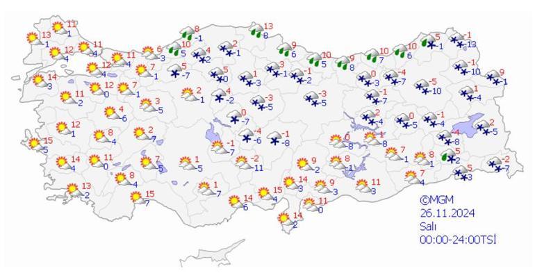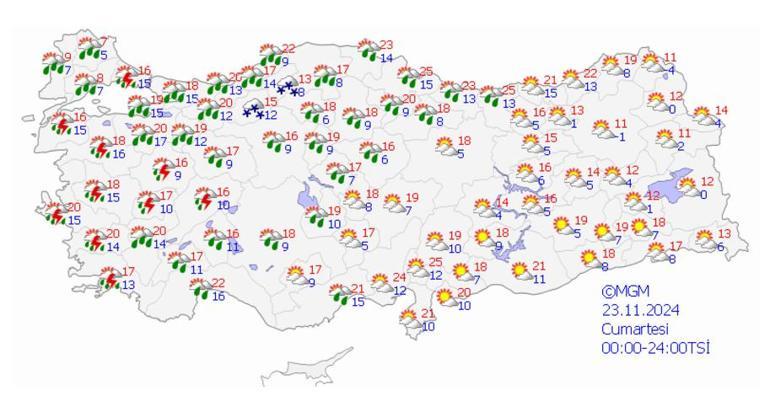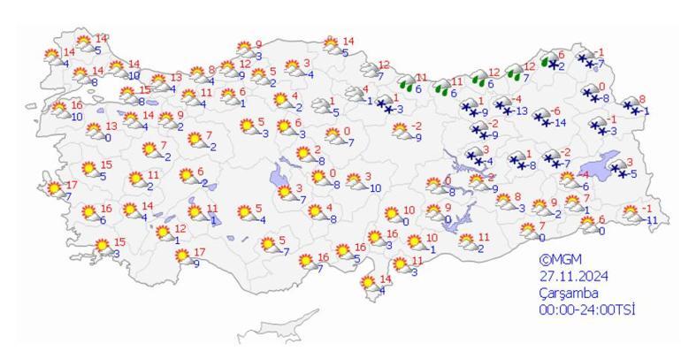 Meteoroloji Genel Müdürlüğü tarafından yapılan son tahminlere göre: Ülkemiz genelinin parçalı ve çok bulutlu, Marmara, Ege, Batı ve Orta Akdeniz, İç Anadolu’nun batısı, Batı Karadeniz ile Samsun, Amasya Çorum, Yozgat, Adana ve Mersin çevrelerinin yağışlı geçeceği tahmin ediliyor. Yağışların; genellikle yağmur ve sağanak, Kıyı Ege ile Batı Akdeniz kıyılarında yer yer gök gürültülü sağanak, Marmara’nın güneybatısı, Batı Karadeniz’in iç kesimleri ile akşam saatlerinden sonra iç bölgelerin yükseklerinde karla karışık yağmur ve kar şeklinde olması bekleniyor. Yağışların Marmara, Kıyı Ege ve Batı Karadeniz’de kuvvetli, Kocaeli, Sakarya, Düzce, Zonguldak, Bartın ile Antalya’nın doğu çevrelerinde çok kuvvetli ve yer yer şiddetli olması bekleniyor. Rüzgarın Marmara, Batı Karadeniz ve Kuzey Ege’de kuzeyli yönlerde kuvvetli, yer yer fırtına (50-80km/saat), İç Anadolu’nun batısı ve Batı Akdeniz’de güneyli yönlerden kuvvetli (40-70 km/saat) olarak eseceği tahmin ediliyor.