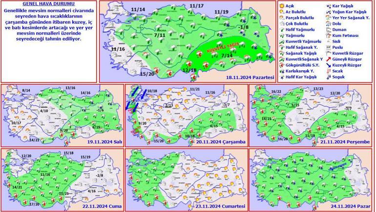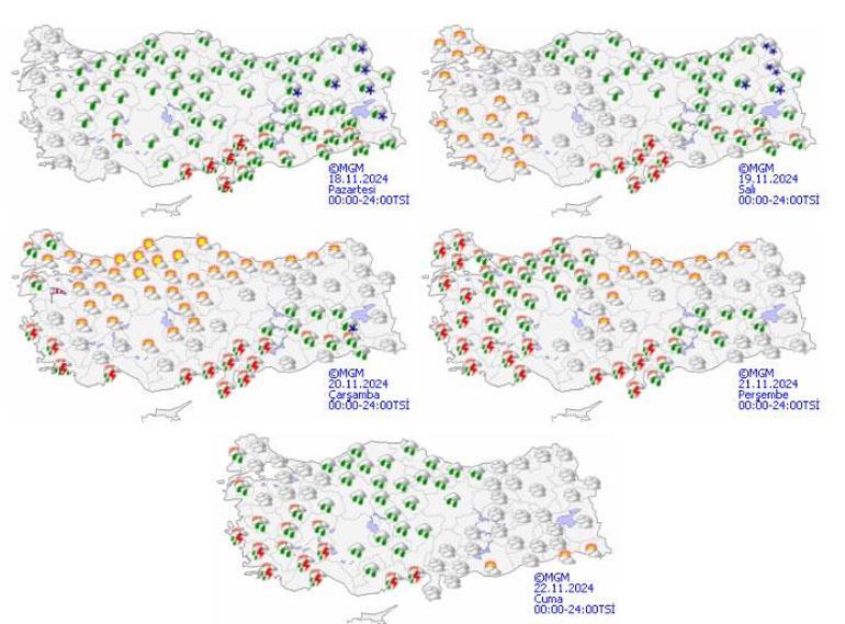 Meteoroloji Genel Müdürlüğü tarafından yapılan son tahminlere göre: Ülkemiz genelinin parçalı ve çok bulutlu, Marmara’nın güneyi, Ege, Akdeniz, İç Anadolu, Orta Karadeniz’in iç kesimleri, Doğu Anadolu’nun güney ve batısı ile Güneydoğu Anadolu’nun kuzey ve batısının yağmur ve sağanak yağışlı, Doğu Anadolu’nun güneydoğusunun yükseklerinin karla karışık yağmur ve kar yağışlı geçeceği tahmin ediliyor. Yağışların; Batı Akdeniz kıyıları ile Doğu Akdeniz ile Gaziantep ve Kilis çevrelerinde yerel kuvvetli olması bekleniyor. Sabah ve gece saatlerinde kuzey ve doğu kesimlerde pus ve yer yer sis bekleniyor.