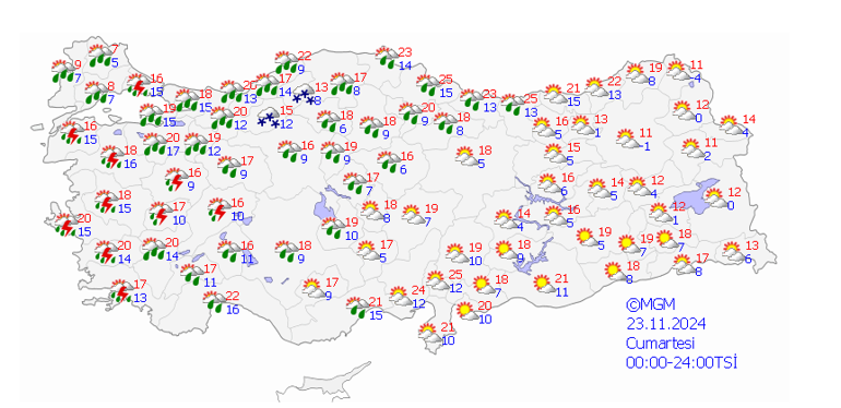 Meteoroloji Genel Müdürlüğü tarafından yapılan son tahminlere göre: Ülkemiz genelinin parçalı ve çok bulutlu, Marmara, Ege, Akdeniz, İç Anadolu, Batı ve Orta Karadeniz ile Doğu Karadeniz kıyılarının yağışlı geçeceği tahmin ediliyor. Yağışların; genellikle yağmur ve sağanak, Kıyı Ege ile Batı Akdeniz kıyılarında yer yer gök gürültülü sağanak, Marmara’nın güneydoğusu, Batı Karadeniz’in iç kesimleri ile akşam saatlerinden sonra iç bölgelerde karla karışık yağmur ve kar şeklinde olması bekleniyor. Yağışların; Marmara, Kuzey ve Kıyı Ege, Orta ve Doğu Akdeniz, İç Anadolu’nun güney ve doğusu ile Batı ve Orta Karadeniz’de kuvvetli, Kocaeli, Sakarya, Düzce, Zonguldak, Bartın ile Antalya’nın doğu çevrelerinde çok kuvvetli ve yer yer şiddetli olması bekleniyor. Rüzgarın Marmara, Batı Karadeniz, Kuzey Ege, İç Anadolu ve Akdeniz’in iç kesimlerinde kuzeyli yönlerde kuvvetli, yer yer fırtına (50-80km/saat) şeklinde eseceği tahmin ediliyor.