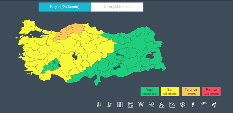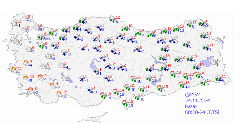 Marmara, Kuzey ve Kıyı Ege, Orta ve Doğu Akdeniz, İç Anadolu’nun güney ve doğusu ile Batı ve Orta Karadeniz’de kuvvetli, istanbul, Kocaeli, Sakarya, Düzce, Zonguldak, Bartın ile Antalya’nın doğu çevrelerinde çok kuvvetli yagis var. Yagişlar sağanak, akşam İstanbul hariç karla karışık yağmur ve kar.