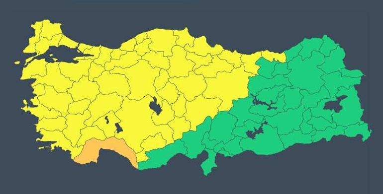 Meteoroloji bugün “Afyonkarahisar, Amasya, Ankara, Antalya, Aydın, Balıkesir, Bilecik, Bolu, Burdur, Bursa, Çanakkale, Çankırı, Çorum, Denizli, Edirne, Eskişehir, Giresun, Isparta, İstanbul, İzmir, Kastamonu, Kayseri, Kırklareli, Kırşehir, Kocaeli, Konya, Kütahya, Manisa, Muğla, Nevşehir, Niğde, Ordu, Sakarya, Samsun, Sinop, Sivas, Tekirdağ, Tokat, Trabzon, Uşak, Yozgat, Zonguldak, Aksaray, Karaman, Kırıkkale, Bartın, Yalova, Karabük, Düzce” için sarı alarm verdi.