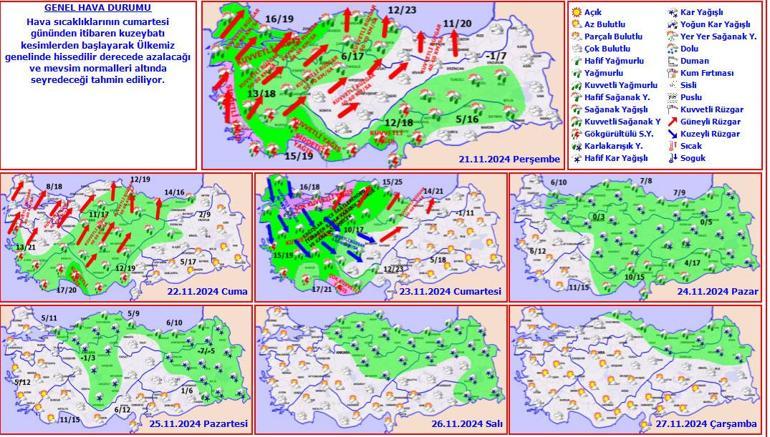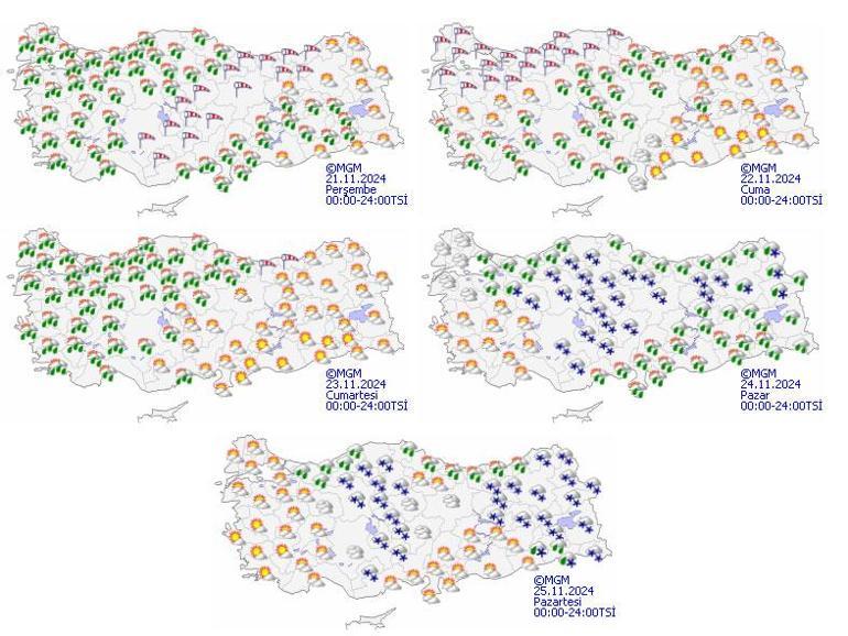 Meteoroloji Genel Müdürlüğü tarafından yapılan son tahminlere göre: Ülkemiz genelinin parçalı ve çok bulutlu, Marmara, Ege, Akdeniz, İç Anadolu, Batı ve Orta Karadeniz, Doğu Anadolu’nun güneybatısı, Güneydoğu Anadolu’nun kuzey ve batısı ile Giresun, Tunceli, Bingöl, Muş ve Bitlis çevreleri ile Erzurum ve Erzincan’ın güney kesimlerinin yağmur ve sağanak, Kıyı Ege ile Akdeniz kıyılarının yer yer gök gürültülü sağanak yağışlı, gece saatlerinde Tunceli, Bingöl, Muş’un yüksek kesimleri ile Erzincan ve Erzurum’un güneyinin karla karışık yağmur ve kar yağışlı geçeceği tahmin ediliyor. Yağışların, Marmara, Kıyı Ege, Batı Akdeniz, Adana, Düzce, Zonguldak, Bolu ve Bartın çevrelerinde kuvvetli, İzmir, Aydın, Muğla çevreleri ile Antalya’nın doğu kesimlerinde yer yer çok kuvvetli olması bekleniyor.