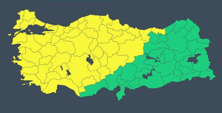 Meteoroloji bugün “Afyonkarahisar, Amasya, Ankara, Antalya, Aydın, Balıkesir, Bilecik, Bolu, Burdur, Bursa, Çanakkale, Çankırı, Çorum, Denizli, Edirne, Eskişehir, Giresun, Isparta, İstanbul, İzmir, Kastamonu, Kayseri, Kırklareli, Kırşehir, Kocaeli, Konya, Kütahya, Manisa, Muğla, Nevşehir, Niğde, Ordu, Sakarya, Samsun, Sinop, Sivas, Tekirdağ, Tokat, Trabzon, Uşak, Yozgat, Zonguldak, Aksaray, Karaman, Kırıkkale, Bartın, Yalova, Karabük, Düzce” için sarı alarm verdi.