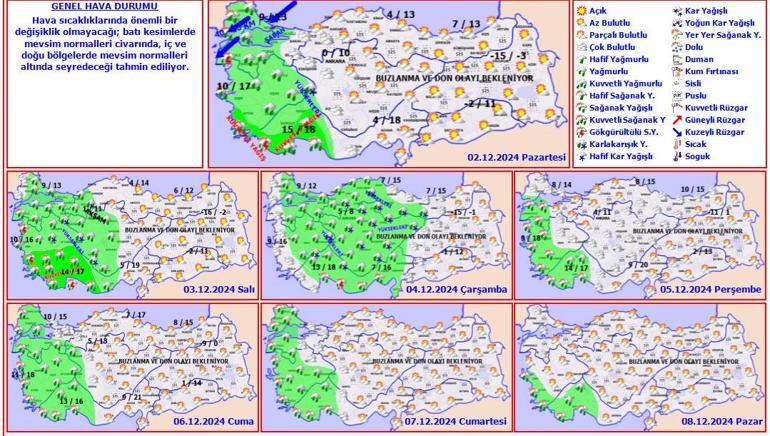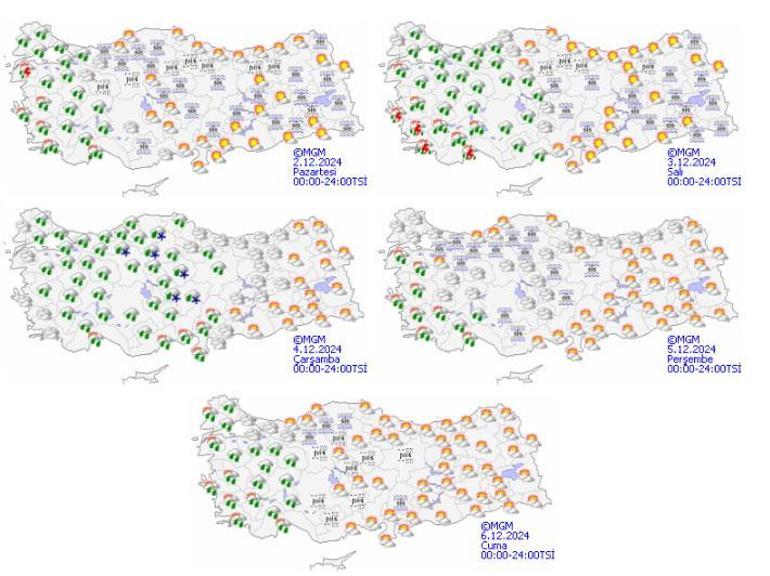 Meteoroloji Genel Müdürlüğü tarafından yapılan son tahminlere göre: Ülkemizin kuzey, iç ve batı kesimlerinin parçalı ve çok bulutlu, Marmara’nın batısı, Ege (Afyonkarahisar hariç) ile Bursa ve Yalova çevrelerinin sağanak ve yer yer gök gürültülü sağanak yağışlı, diğer yerlerin az bulutlu ve açık geçeceği tahmin ediliyor. Yağışların; Kıyı Ege ve Çanakkale çevreleri ile Balıkesir’in batı ilçelerinde yerel kuvvetli olması bekleniyor. Kuzey, iç ve doğu kesimlerde buzlanma ve don olayı ile birlikte pus ve yer yer sis bekleniyor.