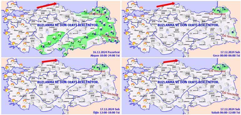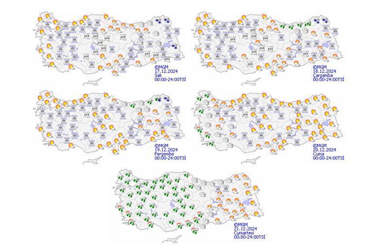 Meteoroloji Genel Müdürlüğü tarafından yapılan son tahminlere göre: Ülkemizin doğu kesimlerinin parçalı ve çok bulutlu, Doğu Anadolu’nun doğusu, Güneydoğu Anadolu’nun kuzey ve batısı ile Antalya’nın doğu kıyıları, Trabzon, Rize, Artvin, Hatay, Osmaniye, Ardahan, Kayseri, Aksaray, Kahraman ve Niğde çevrelerinin yağışlı olup kıyılarda sağanak ve yağmur, iç kesimlerde karla karışık yağmur ve kar yağışlı, diğer yerlerin az bulutlu ve açık geçeceği tahmin ediliyor. Doğu Karadeniz’in iç kesimlerinin yüksekleri ile Doğu Anadolu’nun doğusunun dik ve eğimli yamaçlarında çığ tehlikesi bulunmaktadır. Ülkemizin iç ve doğu kesimlerinde buzlanma ve don ile birlikte pus ve yer yer sis bekleniyor. Rüzgarın, Batı Karadeniz kıyılarında batılı yönlerden kuvvetli (40-60 km/sa) olacağı tahmin ediliyor.