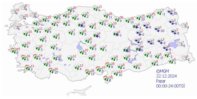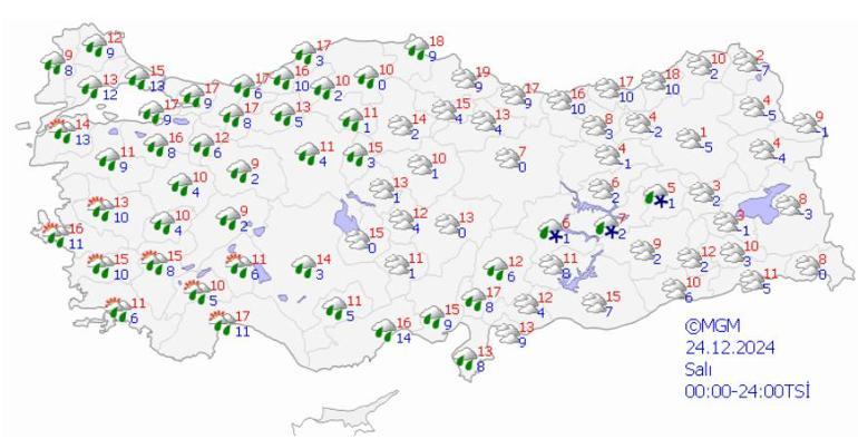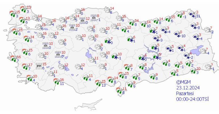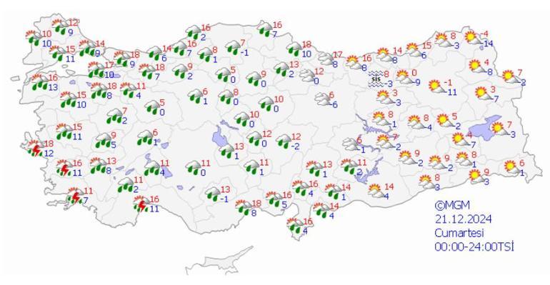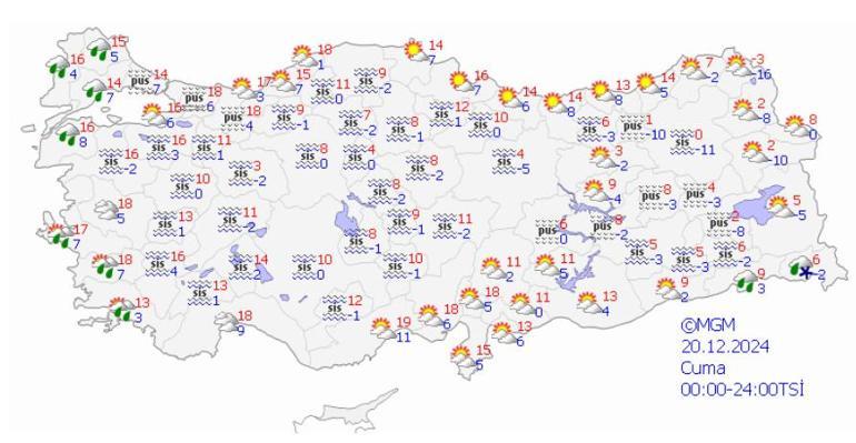 Meteoroloji Genel Müdürlüğü tarafından yapılan son tahminlere göre: Ülkemiz genelinin parçalı ve çok bulutlu, öğle saatlerinde sonra İzmir, Aydın ve Muğla çevrelerinin yağmur ve sağanak yağışlı geçeceği tahmin ediliyor. Gece ve sabah saatlerinde Marmara ile iç ve doğu kesimlerde pus ve yer yer sis bekleniyor.