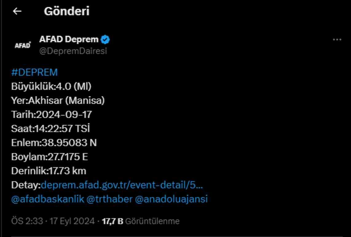 Afet ve Acil Durum Yönetimi Başkanlığının (AFAD) internet sitesinde yer alan bilgiye göre, saat 14.22’de merkez üssü Akhisar olan 4 büyüklüğünde sarsıntı kaydedildi.