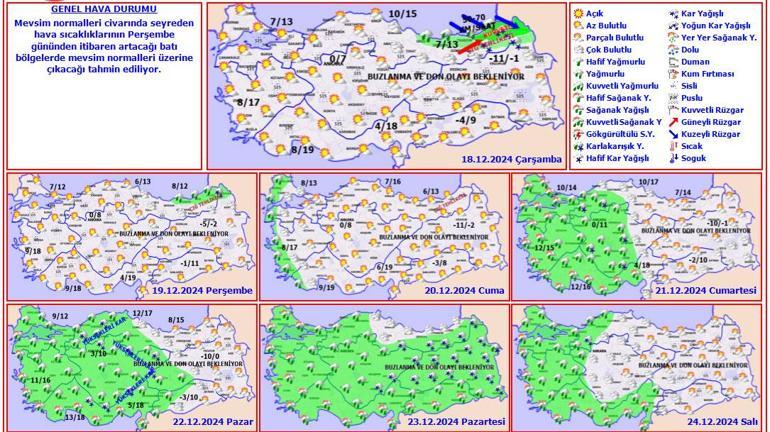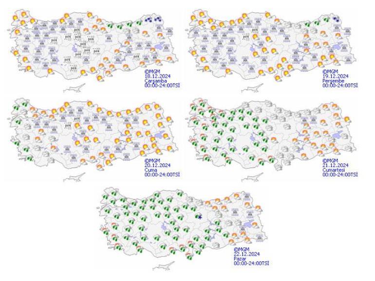 Meteoroloji Genel Müdürlüğü tarafından yapılan son tahminlere göre: Ülkemizin kuzey, iç ve doğu kesimlerinin parçalı ve çok bulutlu, Doğu Karadeniz kıyıları ile Bartın, Sinop ve Ordu çevrelerinin yağmur ve sağanak yağışlı, Doğu Karadeniz’in iç kesimleri ile Ardahan çevrelerinin karla karışık yağmur ve kar yağışlı, diğer yerlerin az bulutlu ve açık geçeceği tahmin ediliyor. Yağışların; Rize ve Artvin kıyılarında kuvvetli yağmur ve sağanak, Ardahan ile Rize ve Artvin’in iç ve yüksek kesimlerinde yoğun kar yağışı şeklinde etkili olması bekleniyor. Rüzgarın Doğu Karadeniz kıyıları ile Ardahan çevrelerinde kuzeybatı, Doğu Karadeniz’in iç kesimlerinde batı ve güneybatı yönlerden kuvvetli ve kısa süreli fırtına(50-70 km/saat) şeklinde eseceği tahmin ediliyor. Bu sabah ve gece saatlerinde İç ve doğu kesimlerde buzlanma ve don ile birlikte pus ve yer yer sis bekleniyor. Doğu Karadeniz’in iç kesimlerinin yüksekleri ile Doğu Anadolu’nun yükseklerinin dik ve eğimli yamaçlarında çığ tehlikesi bulunmaktadır.