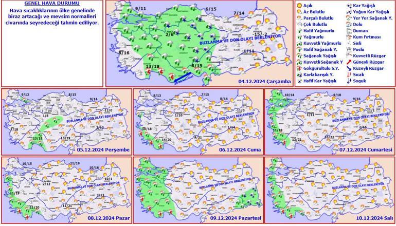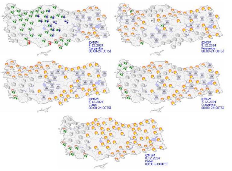 Meteoroloji Genel Müdürlüğü tarafından yapılan son tahminlere göre: Yurt genelinin parçalı ve çok bulutlu, Marmara’nın doğusu, Doğu Akdeniz, İç Anadolu, Batı Karadeniz, Orta Karadeniz’in iç kesimleri ile Kırklareli, Tekirdağ, Kütahya, Afyonkarahisar, Uşak, Antalya, Isparta, Gaziantep ve Kilis çevrelerinin yağışlı geçeceği tahmin ediliyor. Yağışların genellikle yağmur ve sağanak, Akdeniz kıyılarında yer yer gök gürültülü sağanak, İç Anadolu’nun kuzey ve doğusu, Akdeniz Bölgesi’nin iç kesimlerinin yüksekleri ile Batı ve Orta Karadeniz’in iç kesimlerinin yükseklerinde karla karışık yağmur ve kar şeklinde olması bekleniyor. Yurdun doğu kesimlerinde buzlanma ve don olayı ile birlikte pus ve yer yer sis hadisesi bekleniyor.