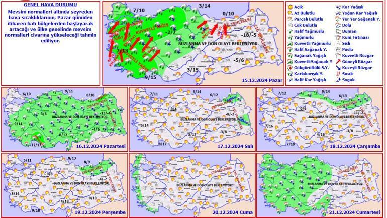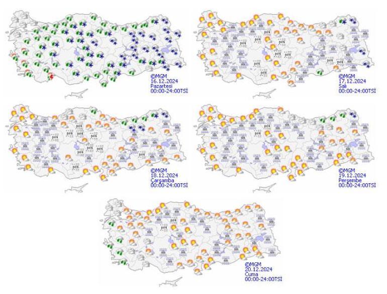 Meteoroloji Genel Müdürlüğü tarafından yapılan son tahminlere göre: Ülkemiz genelinin parçalı ve çok bulutlu, Marmara, Ege, Batı Akdeniz, İç Anadolu, Batı ve Orta Karadeniz ile Mersin, Giresun, Trabzon ve Gümüşhane çevrelerinin aralıklı yağışlı geçeceği tahmin ediliyor. Yağışların, Marmara’nın güney ve doğusu, Ege kıyıları, Batı Karadeniz kıyıları ile Manisa, Denizli, Burdur ve Antalya çevrelerinde kuvvetli yağmur ve sağanak, Bilecik, Uşak, Kütahya, Isparta, Eskişehir, Ankara, Çankırı, Bolu, Karabük, Kastamonu ve Çorum çevrelerinde kuvvetli karla karışık yağmur ve kar şeklinde olması bekleniyor. Ülkemizin iç ve doğu kesimlerinde buzlanma ve don ile birlikte pus ve yer yer sis hadisesi görüleceği tahmin ediliyor. Doğu Karadeniz’in iç kesimlerinin yüksekleri ile Doğu Anadolu’nun doğusunun dik ve eğimli yamaçlarında çığ tehlikesi bulunmaktadır.