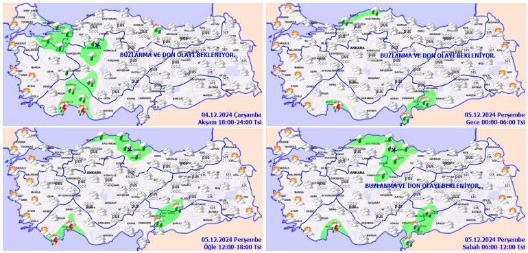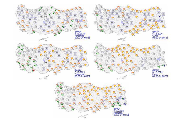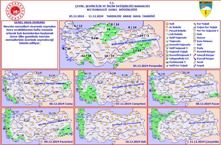 Meteoroloji Genel Müdürlüğü tarafından yapılan son tahminlere göre: Ülkemiz genelinin parçalı ve çok bulutlu, Batı Karadeniz kıyıları, Marmara’doğusu ile Ankara, Konya, Kırıkkale, Samsun, Ordu, Amasya, Çorum, Antalya, Isparta, Hatay, Osmaniye, Gaziantep, Kilis ve Adıyaman çevrelerinin sağanak yağışlı geçeceği tahmin ediliyor. Ülkemizin doğu kesimlerinde buzlanma ve don, iç ve batı kesimlerde sis ve pus olayı bekleniyor.