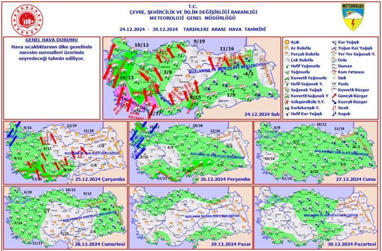 Yağışların; genellikle yağmur ve sağanak, Ege ve Akdeniz kıyılarında yer yer gök gürültülü sağanak, Doğu Karadeniz’in iç kesimleri ile Doğu Anadolu’da yağış alan yerlerde karla karışık yağmur ve kar şeklinde olması bekleniyor. Yağışların, İstanbul, Balıkesir, Bursa, Yalova, İzmir, Uşak, Manisa, Denizli, Adana, Mersin çevreleri ile Çanakkale’nin güney kesimlerinde kuvvetli, Batı Akdeniz, Aydın ve Muğla çevrelerinde çok kuvvetli ve yer yer şiddetli olacağı tahmin ediliyor. Ülkemizin iç ve doğu kesimlerinde buzlanma ve don olayı bekleniyor. Doğu Karadeniz’in iç kesimlerinin yüksekleri ile Doğu Anadolu’nun doğusunun dik ve eğimli yamaçlarında çığ tehlikesi bulunmaktadır.