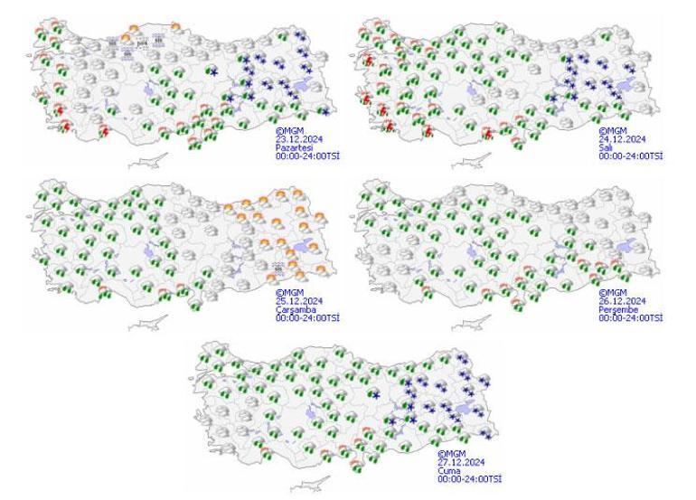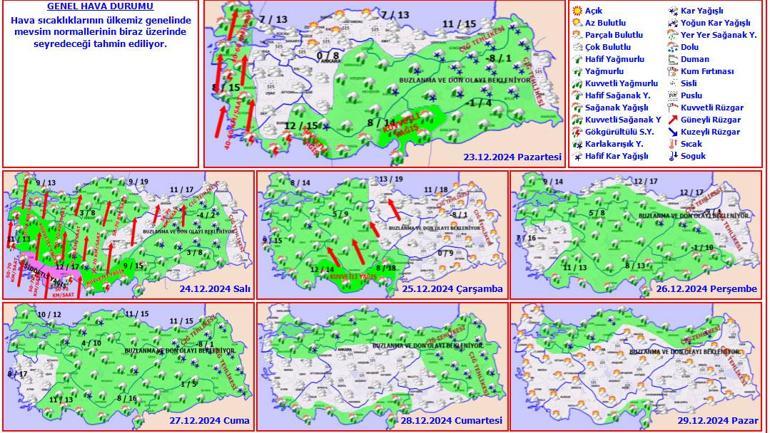 Meteoroloji Genel Müdürlüğü tarafından yapılan son tahminlere göre: Yurt genelinin parçalı ve çok bulutlu, Marmara’nın doğusu, Kuzey Ege’nin iç kesimleri, Doğu Akdeniz, İç Anadolu’nun kuzeyi, Karadeniz, Doğu Anadolu’nun kuzey ve batısı ile Güneydoğu Anadolu’nun yağışlı geçeceği tahmin ediliyor. Yağışların, genellikle yağmur ve sağanak, yurdun güney kıyı kesimlerinde yer yer gök gürültülü sağanak, İç Anadolu’nun doğusu, Batı ve Doğu Karadeniz’in yüksek kesimleri ile Doğu Anadolu’da karla karışık yağmur ve kar şeklinde olması bekleniyor. Yurdun iç ve doğu kesimlerinde buzlanma ve don olayı ile birlikte pus ve yer yer sis hadisesi bekleniyor. Doğu Karadeniz’in iç kesimlerinin yükseklerinde ve Doğu Anadolu’nun doğusunda dik ve eğimli yamaçlarda çığ riski bulunmaktadır.