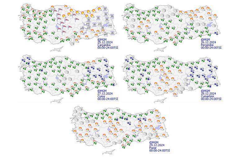 Meteoroloji Genel Müdürlüğü tarafından yapılan son tahminlere göre: Ülkemiz genelinin çok bulutlu, Marmara, Ege, Akdeniz, İç Anadolu’nun batısı ve Batı Karadeniz ile Güneydoğu Anadolu’nun batısının yağışlı geçeceği tahmin ediliyor. Ege’nin güney kıyıları ve kuzey iç kesimlerinde, Doğu Akdeniz’in batısı ve Batı Akdeniz’de kuvvetli olması beklenen yağışların, genellikle yağmur ve sağanak, Ege ve Akdeniz kıyılarında yer yer gök gürültülü sağanak, Batı Karadeniz’in yükseklerinde ve Akdeniz’in Toroslar kesiminde yağış alan yerlerde karla karışık yağmur ve yer yer kar şeklinde görüleceği tahmin ediliyor. Ülkemizin doğu kesimlerinde buzlanma ve don olayı bekleniyor. Doğu Karadeniz’in iç kesimlerinin yüksekleri ile Doğu Anadolu’nun doğusunun dik ve eğimli yamaçlarında çığ tehlikesi bulunmaktadır.