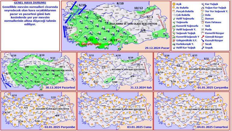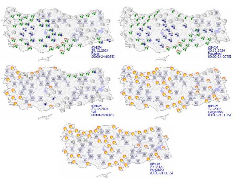 Genellikle yağmur ve sağanak, iç ve yüksek kesimlerde karla karışık yağmur ve kar şeklinde görülecek olan yağışların; Muğla’nın doğusu, Antalya ve Mersin çevreleri ile Adana’nın batısında yerel kuvvetli olması bekleniyor. Rüzgarın; Marmara ve Kıyı Ege’de kuzeyli yönlerden kuvvetli olarak (40-60 km/saat) esmesi bekleniyor. Ülkemizin iç ve doğu kesimlerinde buzlanma ve don ile birlikte pus ve sis bekleniyor. Doğu Karadeniz’in iç kesimlerinin yüksekleri ile Doğu Anadolu’nun yüksek ve dik yamaçlarında çığ tehlikesi bulunmaktadır.