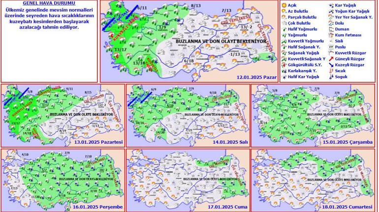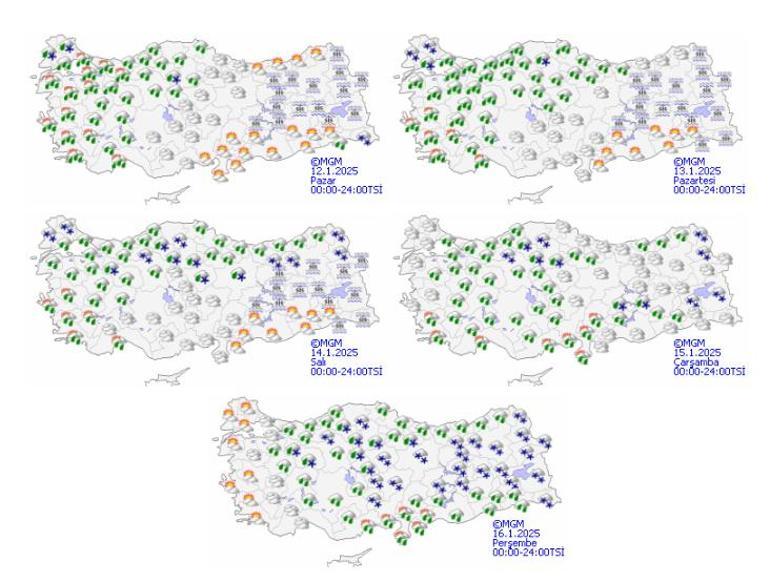 Meteoroloji Genel Müdürlüğü tarafından yapılan son tahminlere göre: Ülkemiz genelinin parçalı yer yer çok bulutlu, Marmara, Ege ve Batı Karadeniz ile Akdeniz’in batı, İç Anadolu’nun kuzeybatı kesimleri ve Hakkari çevrelerinin yağışlı geçeceği; Trakya’nın kuzey, Marmara’nın güney ve batı, Antalya’nın doğu kesimleri ile Ege kıyılarında yer yer kuvvetli olması beklenen yağışların genellikle yağmur ve sağanak, Trakya’nın iç kesimlerinde karla karışık yağmur ve yer yer kar, Hakkari çevrelerinde hafif kar şeklinde görüleceği tahmin ediliyor. Ülkemizin iç ve doğu kesimlerinde buzlanma ve don ile birlikte pus ve yer yer sis görülmesi bekleniyor. Doğu Karadeniz’in iç kesimlerinin yüksekleri ile Doğu Anadolu’nun yüksek ve dik yamaçlarında çığ tehlikesi bulunmaktadır.