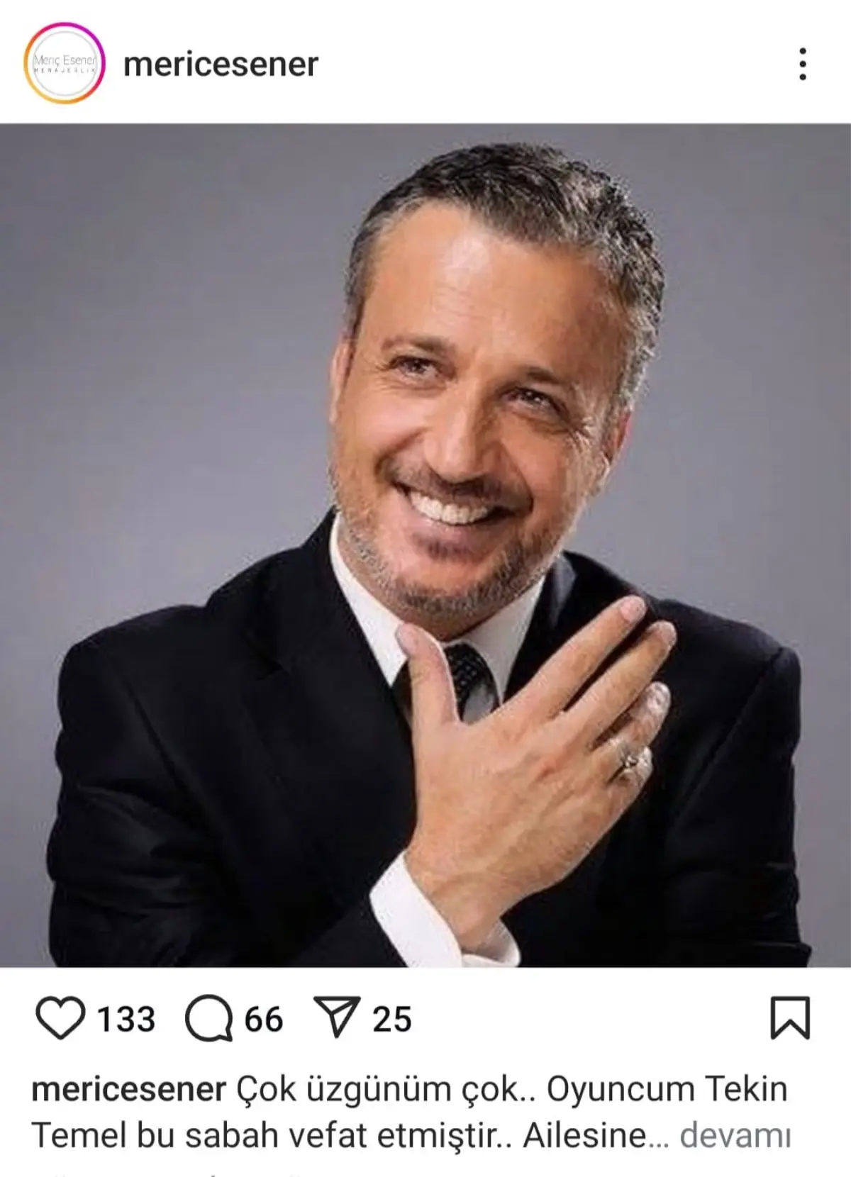 Oyuncu Tekin Temel 56 yaşında hayatını kaybetti. Edinilen bilgiye göre dizi setine gitmek için hazırlandığı sırada kalp krizi geçiren oyuncu hayatını kaybetti. Daha önce de kalp krizi geçirdiği bilinen oyuncunun kalbine stent takılmıştı. Temel’in ölüm haberini menajeri Meriç Esener sosyal medya hesabından yaptığı paylaşımla duyurdu. Esener paylaşımında, “Çok üzgünüm çok. Oyuncum Tekin Temel bu sabah vefat etmiştir. Ailesinin ve tüm sevenlerinin başı sağolsun” ifadelerini kullandı. 56 yaşında hayatını kaybeden Tekin Temel’in cenazesi Ataşehir’deki Refiye Soyak Camiinde ikinci namazına müteakip kılınacak cenaze namazının ardından toprağa verilecek.