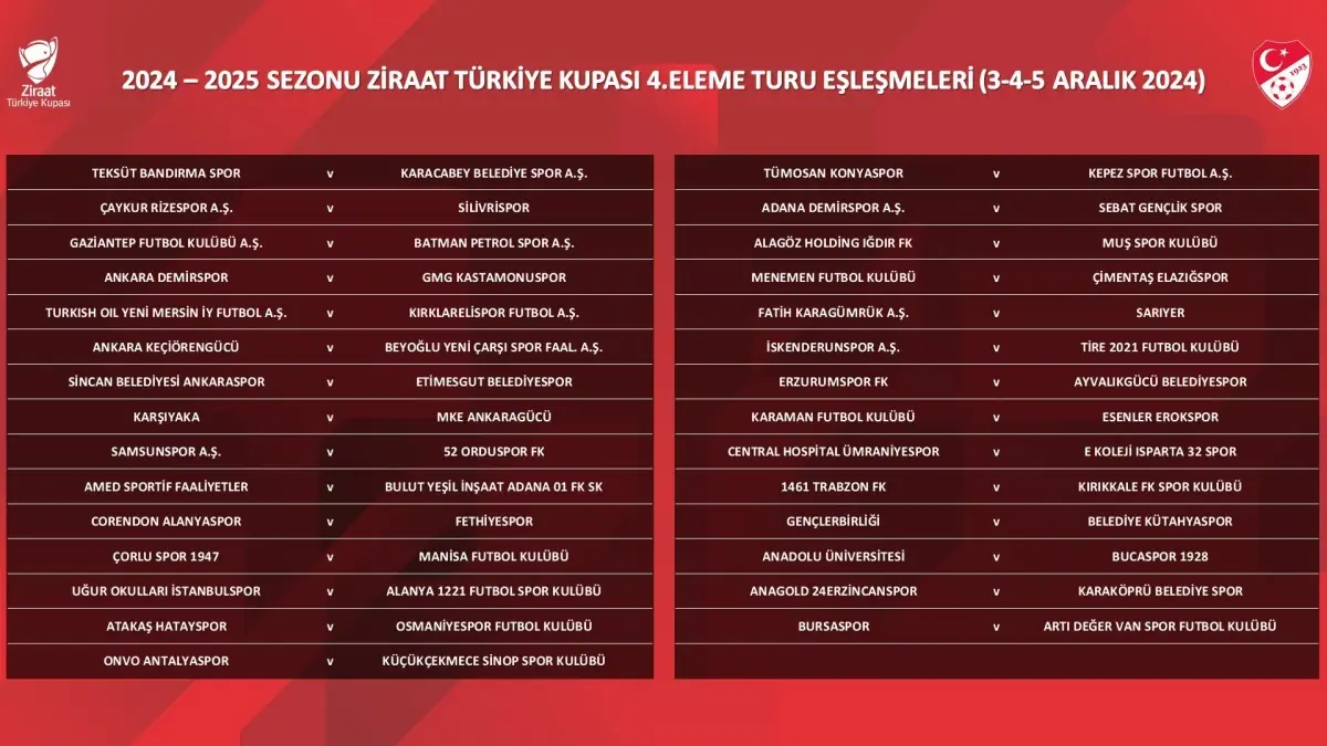 Türkiye Kupası 4’üncü Eleme Turu müsabakalarının kura çekimi, kulüp temsilcilerinin katılımı ile TFF Riva Hasan Doğan Milli Takımlar Kamp ve Eğitim Tesisleri’nde gerçekleştirildi. Kura çekiminde 8’i Süper Lig olmak üzere 58 takım birbirleriyle eşleşti. 4’üncü Eleme Turu’nda maçlar 3-4-5 Aralık tarihlerinde oynanacak.