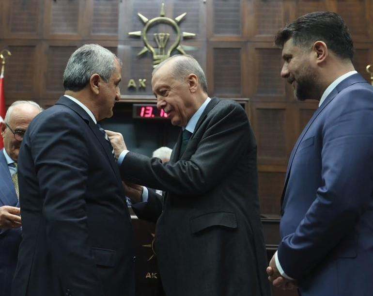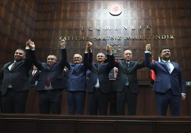 Cumhurbaşkanı Recep Tayyip Erdoğan, partisinin TBMM grup toplantısında yaptığı konuşmanın ardından AK Parti’ye katılan 10 belediye başkanına parti rozetini, taktı.