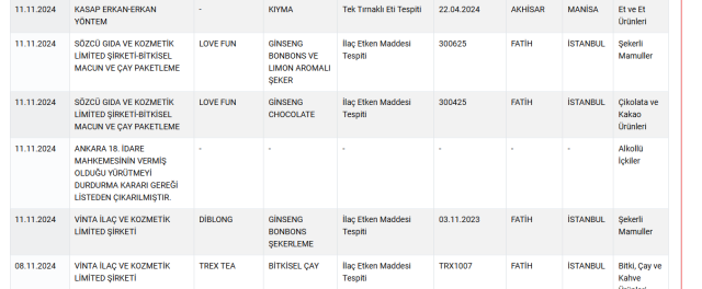 Bakanlığın son listesinde İstanbul’dan birçok firma yer aldı. Sözcü Gıda ve Kozmetik adlı İstanbul Fatih’te faaliyet gösteren bir firmanın ürettiği limon aromalı şeker ve çikolatalarda ilaç etken maddesi tespit edildi.